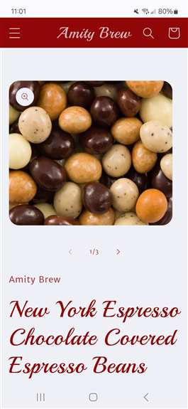 We are an online company featuring chocolate covered espresso beans in Milk chocolate, Dark chocolate, Marble, Mint and New York (mix of all except mint). We also have hot cocoa mix and coffee in ground or whole bean.Product Images: