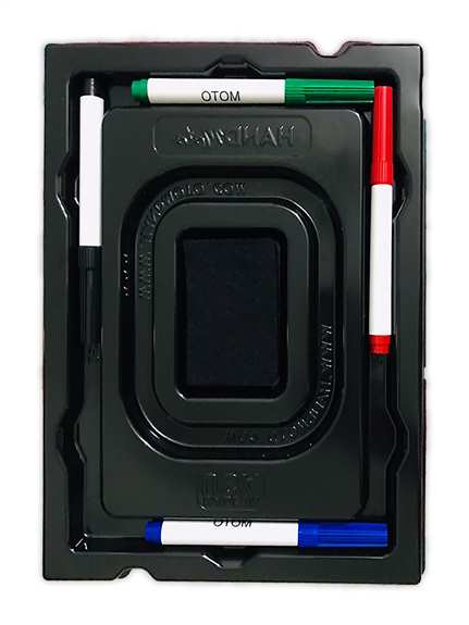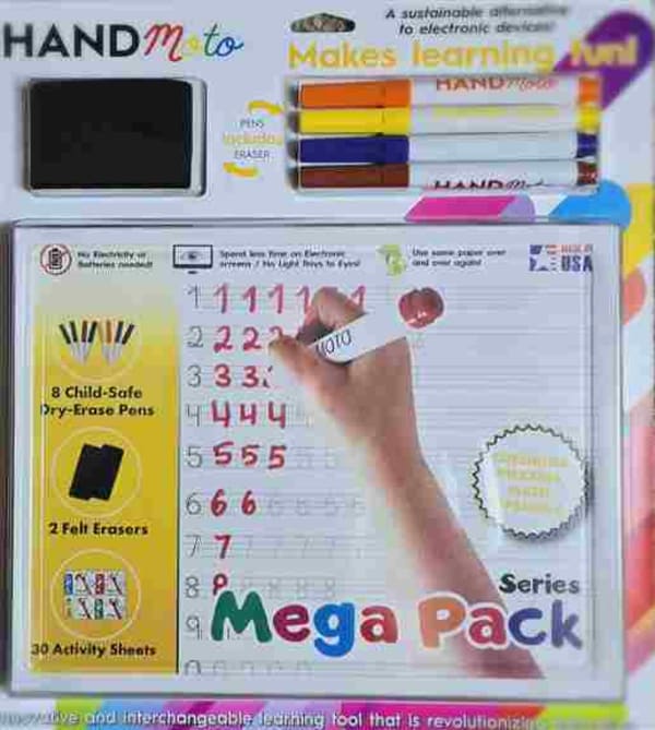 HandMoto(tm) Learning Tablet - a fun, safe, and sustainable alternative to electronic devices for young children. HandMoto that provides a screen-free platform for teaching hand-motor skills development across a variety of subjects and grows with your child through content activity packs. Fun on the Go and encouraging family time. Activity Packs available from ages 2 to 100 starting with languages such as Spanish as well as Adult Memory. All Activity Packs are designed to support specific skills like writing, math, and social skills.Product Images: